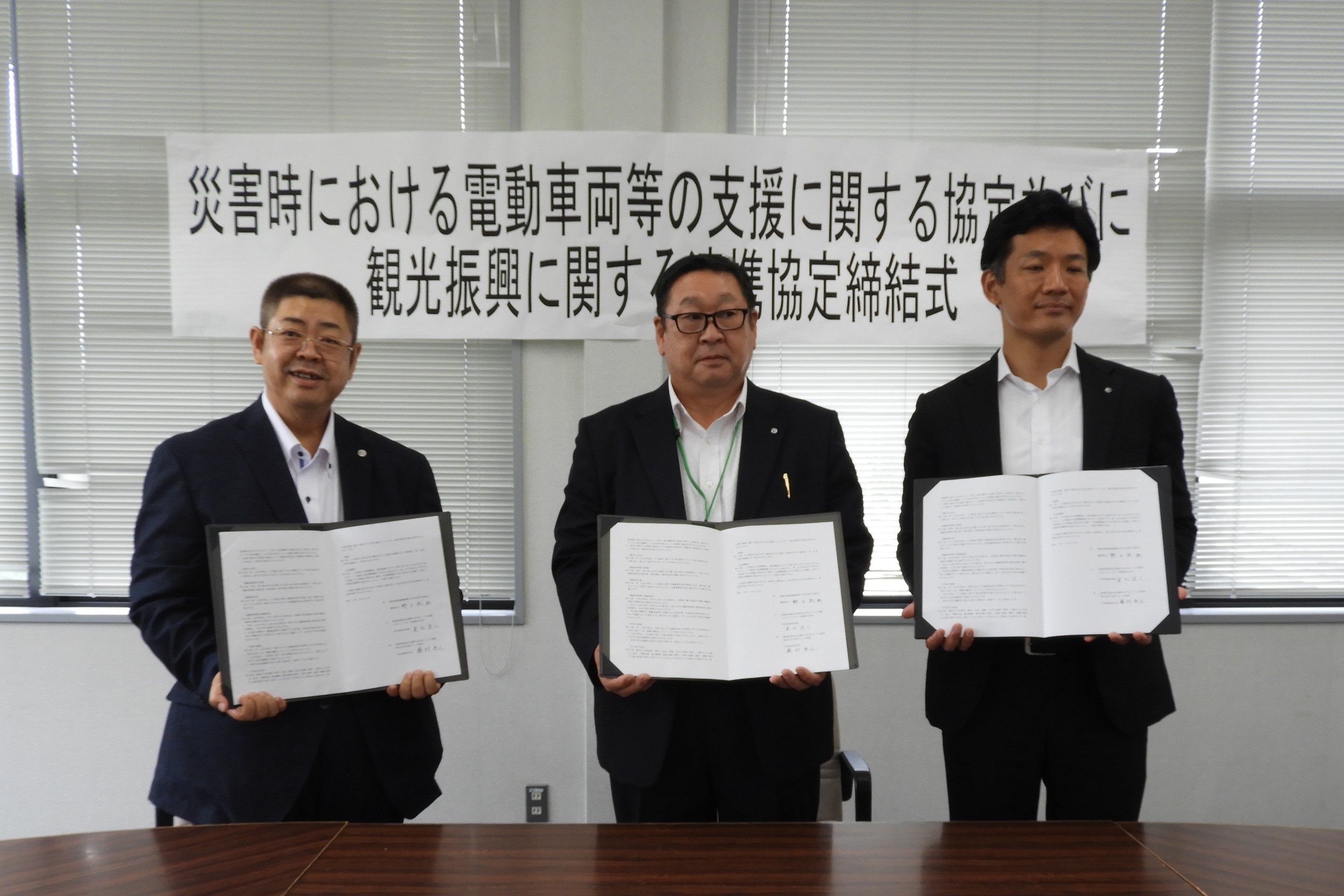 この協定に基づき、町内において大規模停電が発生した場合には、町の要請に基づき、スカイレンタカー四国(株)及び(株)日産サティオ徳島の協力において、電動車両等を貸与をしていただけるものです。