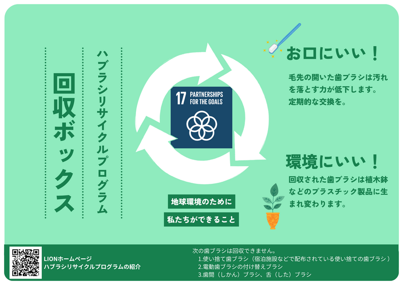 米国のグローバル企業「テラサイクル」の日本法人である「テラサイクルジャパン合同会社」(東京)と「ライオン株式会社」(東京)が実施する使い終わった歯ブラシのリサイクル回収活動です。