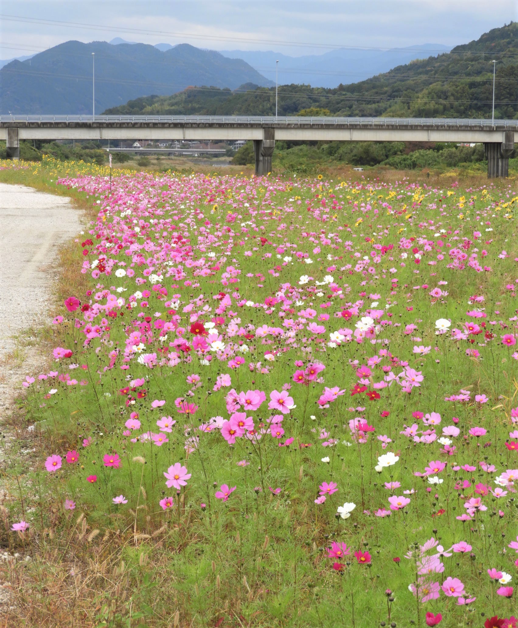 ※今山河川敷のコスモスは、徳島県企業局ダム水源地サポート事業の補助金を活用し、「かつうらを美しくする会」の方々により整備されたものです。